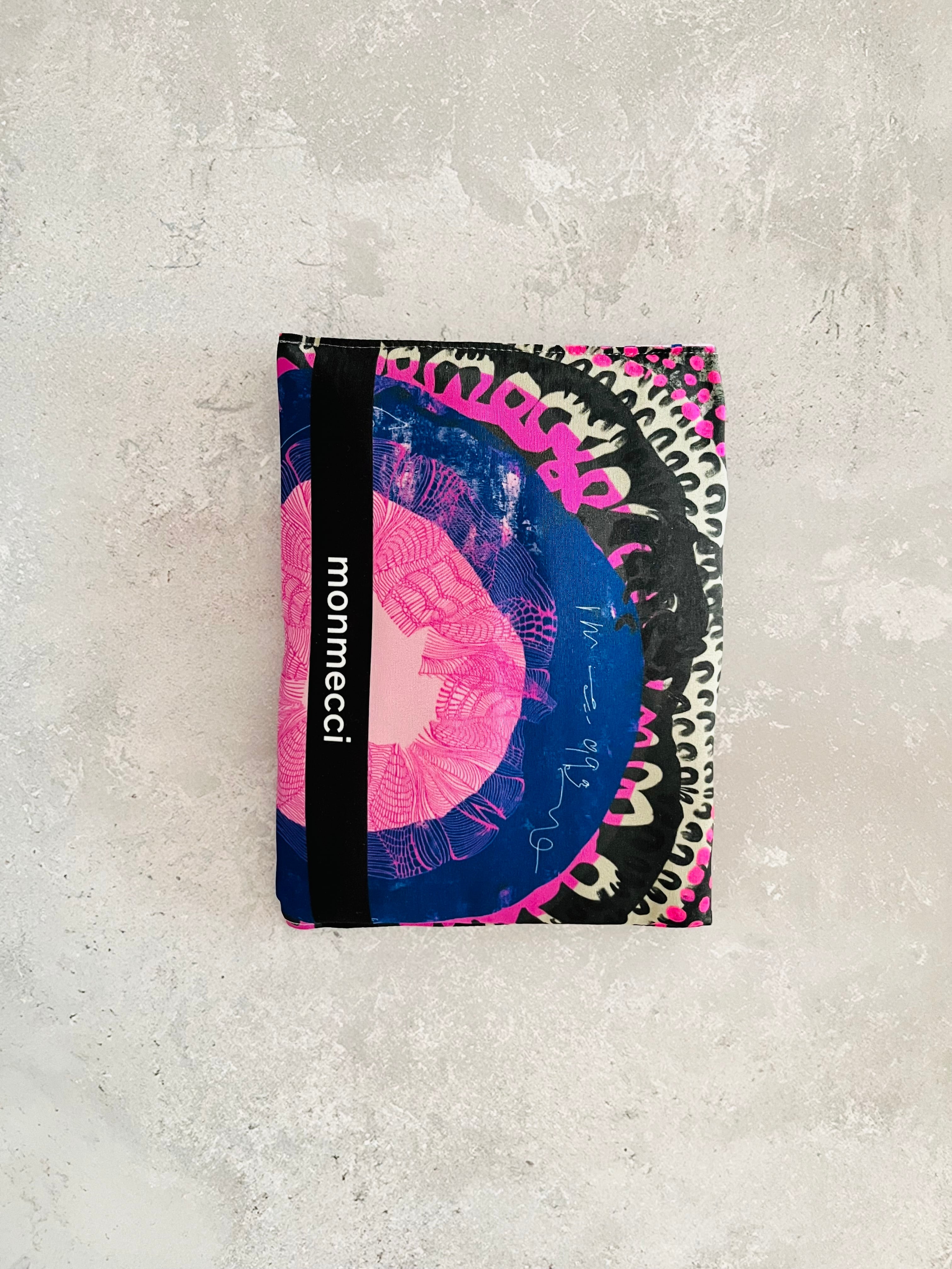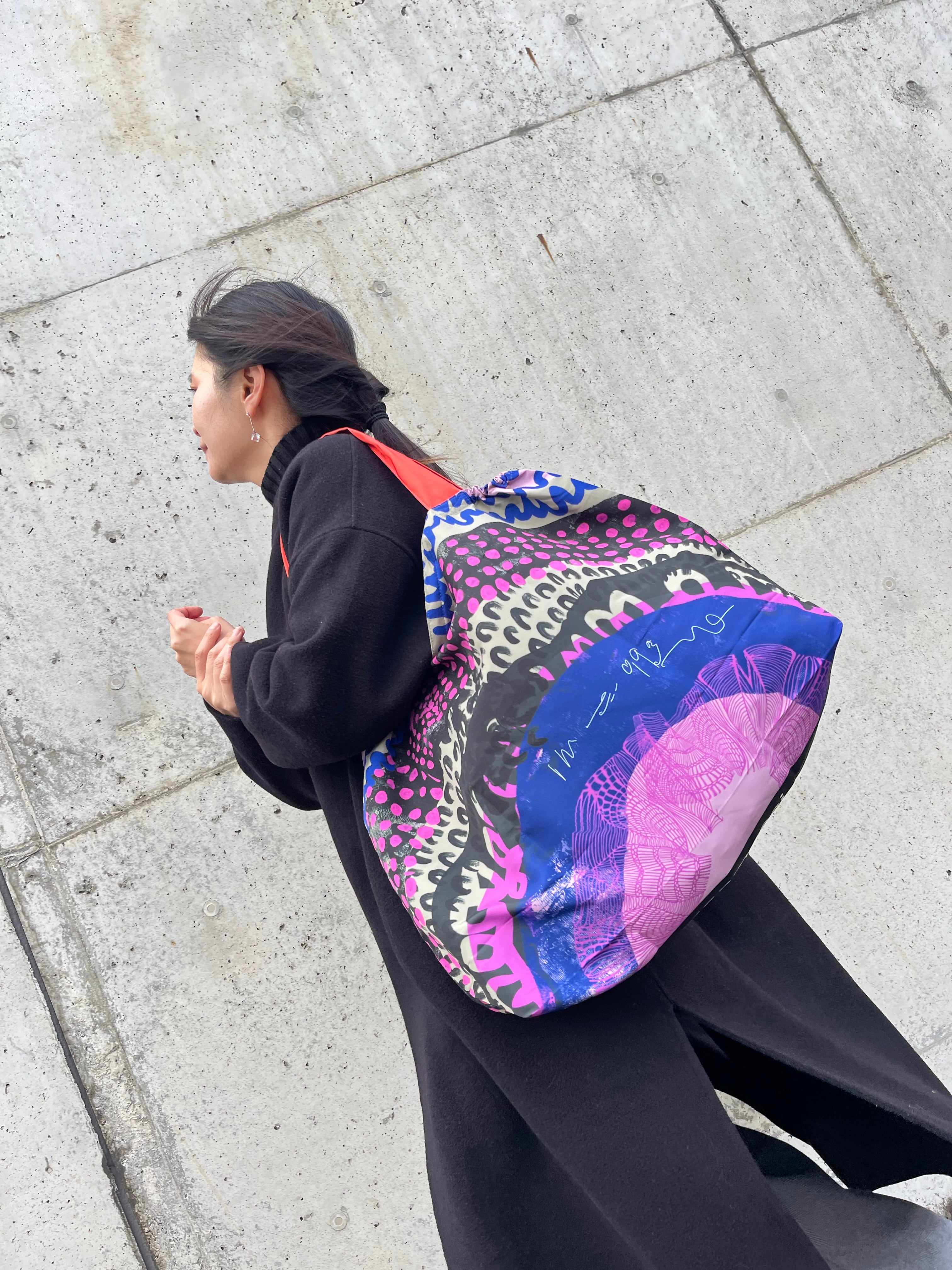 monmecciのオリジナルテキスタイルをプリントした大きなエコバッグ。